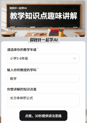 想尝尝 AI 智能讲授,按照提醒顺次输入:年级、学科、学问点、时长和讲授形式。帮力教员们备课提效,能够帮你挖掘学生的心理小搅扰,